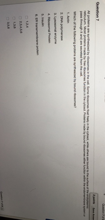 Proteins made by bound ribosomes either function within the endomembrane system or pass through it and are secreted from the cell. Which of the following proteins are synthesized by bound ribosomes 1 Actin 2 DNA polymerase 3 Lysosomal enzyme 4 Ribosomal Protein 5 Insulin 6 ER. InsulinER proteinand lysosomal enzyme.
